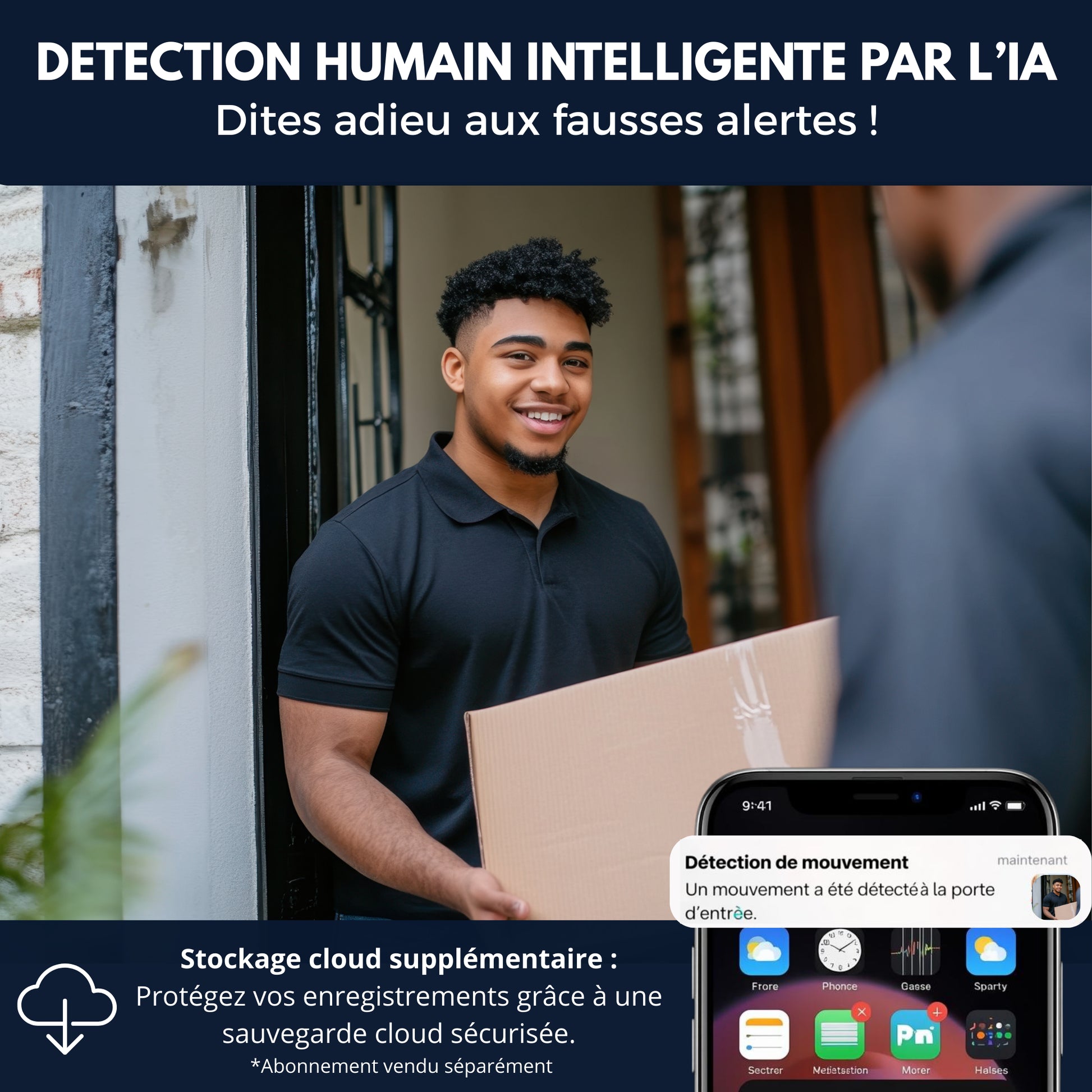 La détection de mouvement par IA avancée vous assure de ne recevoir des alertes que pour les vrais visiteurs, fini les fausse alarmes dues aux voitures qui passent ou aux animaux errants